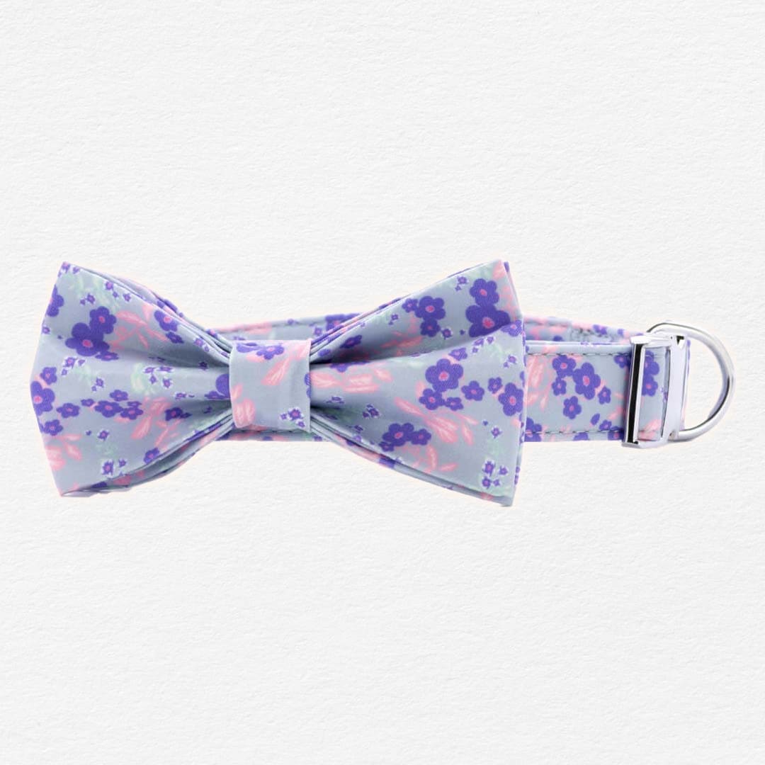 Perfect for special occasions or adding a touch of sophistication to your dog's daily walks, this handcrafted collar features a beautiful cerulean blue fabric adorned with delicate violet patterns. The bow tie sits perfectly at your dog's neck, creating an adorable and dapper look that's sure to turn heads at the dog park.