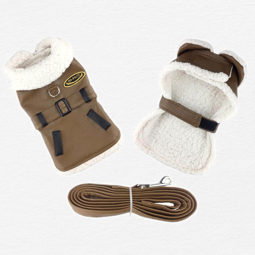 Be ready for winter with this bomber dog coat with a matching leash. Made with Dark Brown Faux Leather Outer Body and complemented with Black Faux Leather Pockets and Belt Loops. It also features an Embroidered Wings Emblem, that says Co-Pilot... for your little Co-pilot buddy. The sherpa lining, collar, and trim are designed to keep your doggie warm. It also has a Re-enforced Double Box Stitched D-Ring for added strength and quality. The belted coat secures around the waist and neck with a touch fastener for a perfect fit.