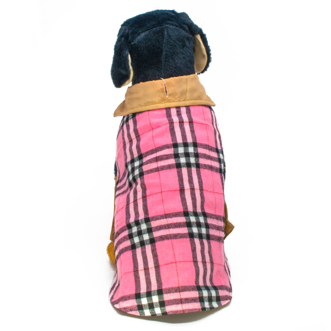Protect your pup in style with this plaid dog coat perfectly tailored for any size or shape. Its delicate pink, black and white plaid pattern looks great on any dog and increases visibility for safety's sake. You will love the soft, pettable jersey-like fabric that offers warmth, protection from damp weather, and plenty of adorable style. Best of all, it is 100% reversible for a different look or feel depending on the elements and your tastes. You can flip up or fold down the collar for a splash of color either way.
