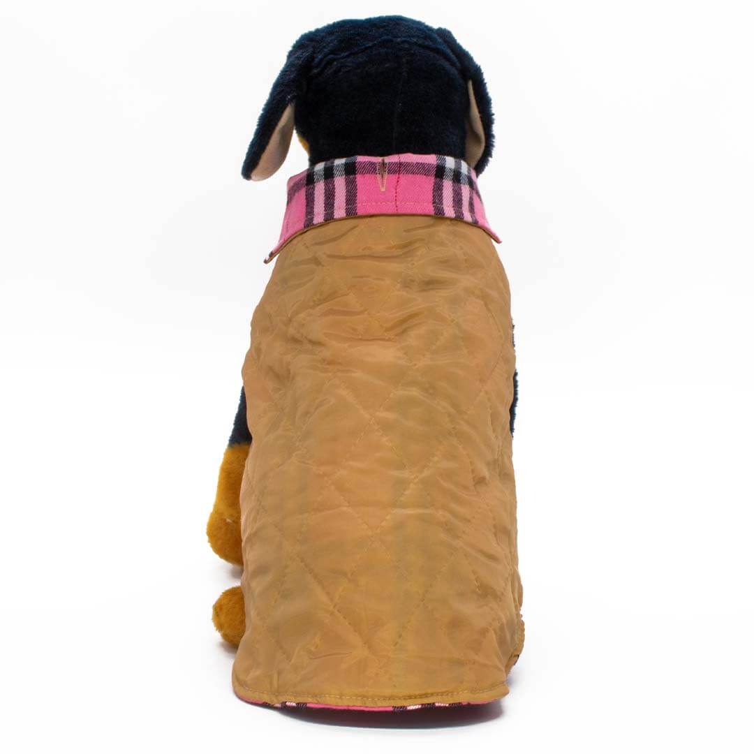 Most of all, you will love how this plaid dog coat protects your furry friend from the elements. The opposite side from the plaid fabric is a water-resistant material in tan with unique diamond patterned stitching. Although you still may need a doggy raincoat for showery or stormy days, this fabric helps keep your pup toasty warm and dry in the fog and drizzle.